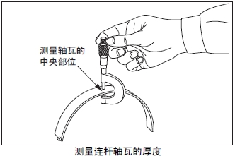 測(cè)量連桿軸瓦的中央部位的厚度。超過極限值時(shí),將軸瓦上下整套更換。根據(jù)曲柄銷的磨損程度,在曲軸重新研磨使用時(shí),使用減小尺寸的軸瓦。曲軸的研磨要領(lǐng)參考「發(fā)動(dòng)機(jī)本體的檢測(cè)、修理」的「曲軸的曲柄銷和曲軸頸的研磨」項(xiàng)。