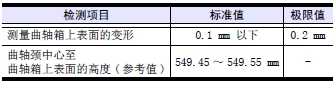 (1) 測(cè)量曲軸的曲柄銷和曲軸頸的外徑。超過極限值時(shí),使用減小尺寸的軸瓦,按照和減小尺寸軸瓦的規(guī)格研磨曲軸。使用-1.00 mm 規(guī)格的減小尺寸主軸瓦仍然超出極限值時(shí),更換新的曲軸。