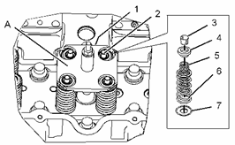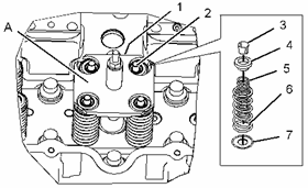 用工具 (A) 壓縮進(jìn)氣門(mén)彈簧 (5) 和排氣門(mén)彈簧 (6) 。 在氣門(mén) (2) 上安裝氣門(mén)彈簧卡座 (3) 。 拆下單體噴油器擋圈 (1) 和工具 (A) 。