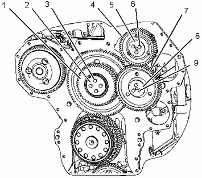 將齒輪組組件 (1) 安置在樞軸上。確保對(duì)準(zhǔn)塔齒輪組件與曲軸齒輪上的正時(shí)標(biāo)記。