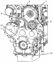 檢查凸輪軸齒輪與可調(diào)節(jié)惰輪齒輪組件之間的齒隙。 此齒隙應(yīng)為 0.356 ± 0.254 mm (0.014 ± 0.010 in)。 參考測(cè)試和調(diào)整, "齒輪總成(前)- 正時(shí)",以了解齒隙調(diào)整步驟。擰緊螺母 (12) 和螺栓至扭矩為 55 ± 10 N·m (41 ± 7 lb ft)。