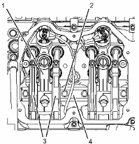 安裝螺栓 (2) ,并擰緊至扭矩為 55 ± 5 N·m (41 ± 4 lb ft)。重新擰緊螺栓 (2) 至扭矩為 55 ± 5 N·m (41 ± 4 lb ft)。 再將螺栓 (2) 轉(zhuǎn)動 60 ± 5 度。 按照以下順序擰緊凸輪軸螺栓:2、3、1、4。