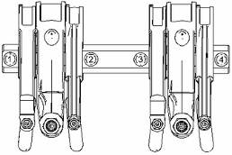用工具 (A) 把搖臂軸組件 (4) 、氣門搖臂 (3) 以及電子單體噴油器搖臂 (1) 作為一個整體安置到缸蓋上。