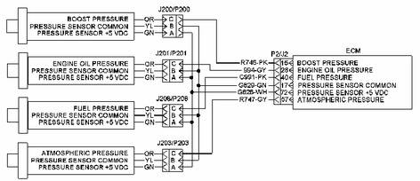 增壓壓力傳感器 發(fā)動(dòng)機(jī)機(jī)油壓力傳感器 燃油壓力傳感器 大氣壓力傳感器+5 V 發(fā)動(dòng)機(jī)壓力傳感器電源由 ECM 連接到各個(gè)壓力傳感器接頭的接線端 A。 來自 ECM 接頭的傳感器公用線接至每個(gè)傳感器接頭的端子 B 上。 傳感器電源受輸出短路保護(hù)。蓄電池短路不會(huì)對(duì) ECM 內(nèi)部電路造成損壞。