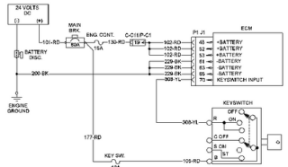 當(dāng)鑰匙開關(guān)處于接通位置或起動(dòng)位置時(shí),ECM 通過 P1-70 接收鑰匙開關(guān)的輸入。 當(dāng) ECM 檢測到此輸入處有蓄電池電壓時(shí),ECM 就會(huì)通電啟動(dòng)。 當(dāng)斷開此輸入的蓄電池電壓時(shí),ECM 就會(huì)斷電停機(jī)。