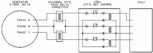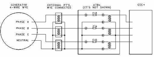 在四線 Y 形發(fā)電機上,除非完全持續(xù)的平衡掉負載,需要三個獨立的電壓互感器(PT's)來提高功率表的精度。 即使負載已經(jīng)平衡,仍然不能確定一些 功率參數(shù) GSC+顯示屏上沒有顯示這些參數(shù):有效功率相位 A、B、C 和功率因數(shù)相位 A、B、C ATB+包括三個電壓互感器,以適應4 線 Y 形發(fā)電機。 當 4 線 Y 形發(fā)電機組使用一個開放三角形 PT 配置時,沒有利用ATB+的全部性能。