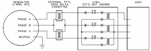 四線 Y 形發(fā)電機上的外置電壓互感器 (PT) 的開放三角發(fā)電機 這個配置允許通過GSC+對功率參數(shù)進行精確測量,包括在沒有平衡負載和中性電流存在時。 有效功率相位 A、B、C 和功率因數(shù)相位 A、B、C 不能確定,并且沒有顯示在GSC+顯示屏上。 |