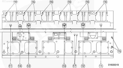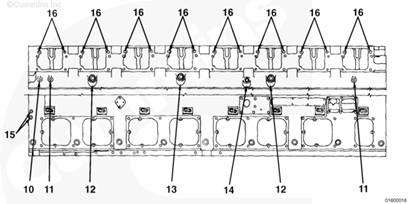 對缸體進(jìn)行了改動(dòng)以便能夠安裝較長的缸蓋螺釘。以前的康明斯發(fā)動(dòng)機(jī)必須使用長度為 171 mm [6.73 in] 的螺釘?,F(xiàn)在的康明斯發(fā)動(dòng)機(jī)必須使用長度為 203 mm [8.00 in] 的螺釘。短螺釘可用于維修。這些螺釘都是鍍鎘的(銀色或金色)。必須將這些短螺釘擰緊至 353 N•m [260 ft-lb]。如果短螺釘表面具有 lubrite 鍍層,而且顏色是黑色,則必須予以更換。203 mm [8 in] 螺釘只能使用 lubrite 鍍層。555 N•m [409 ft-lb] 扭矩必須施加在這些螺釘上。K50 康明斯發(fā)動(dòng)機(jī)總是使用 203 mm [8.00 in] 螺釘。