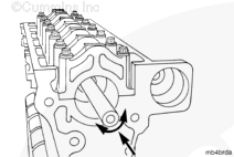 檢查松動(dòng)的主軸承蓋。如圖所示,如果主軸承蓋不超過缸體 0.000 至 0.025 mm [0.0000 至 0.0010 in],則必須更換主軸承蓋。