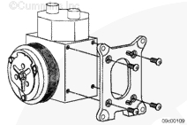 在制冷劑壓縮機上安裝制冷劑壓縮機安裝支架。制冷劑壓縮機固定在支架凸緣的頂部。安裝 4 根安裝螺栓和制冷劑壓縮機支架。擰緊螺栓。
