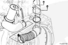 從部件上拆下保護蓋。潤滑 EGR 后連接管的軟管端。安裝軟管卡箍但不要擰緊,在 EGR 冷卻器和 EGR 閥安裝支架上安裝 EGR 后連接管和密封墊。擰緊 2 個螺釘。