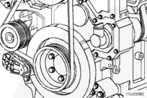 使用壓縮機(jī)驅(qū)動(dòng)裝置或盤車裝置沿順時(shí)針旋轉(zhuǎn)方向(從發(fā)動(dòng)機(jī)前方看)盤動(dòng)發(fā)動(dòng)機(jī)。將減振器上的 A 標(biāo)記與齒輪室蓋上的指示箭頭對(duì)齊。