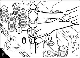 2 Use the special tool (B), GE5004, together with the sleeve (B2), GE50044, to install the valve guide. The