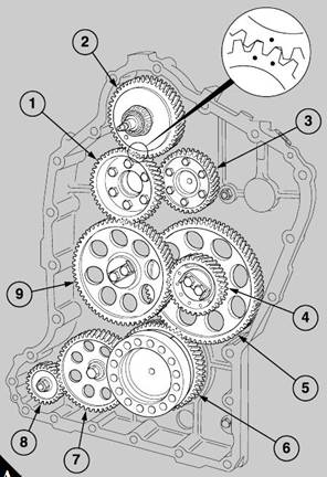 The arrangement of the timing gears consists of the