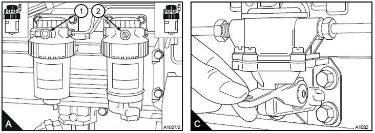 松開(kāi)主濾清器上的放氣螺釘(A1)。操作燃油輸油泵的注油桿,直到排出從banjo螺栓進(jìn)入燃油中的空氣。擰