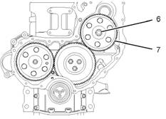 2.松開鎖緊螺釘(5)。轉(zhuǎn)動隔套(6),以便將鎖緊螺釘(5)擰緊抵到噴油泵的軸上。逆時針方向轉(zhuǎn)動噴油泵齒輪來消除齒隙。將鎖緊螺釘(5)擰緊至扭矩17N·m(13lbft)。