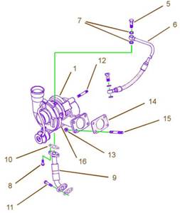 注:回油管組件(9)上法蘭需用6mm調(diào)整螺釘(8)固定到渦輪增壓器(1)上?;赜凸芙M件(9)下法蘭需用8mm調(diào)整螺釘(11)固定到缸體上。