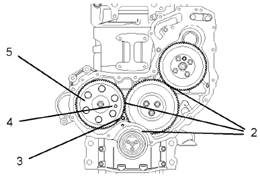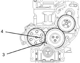 2.確保1號氣缸仍處在其壓縮沖程的上止點位置。如有必要,請參閱《Perkins1103/1104柴油發(fā)動機測試和調(diào)整手冊》,“查找1號活塞的上止點位置”。確保安裝了曲軸正時銷(3)和凸輪軸正時銷(4)。
