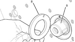 2.將一層少量、連續(xù)的(11)21820603POWERPARTRetainer(耐油)涂到軸承(9)的外表面上。將前殼體(6)的前法蘭放置到一個合適的支座上。按壓軸承(9)的外座圈,直至軸承靠到前殼體(6)中軸承的凹口前面。清除所有多余的密封膠。
