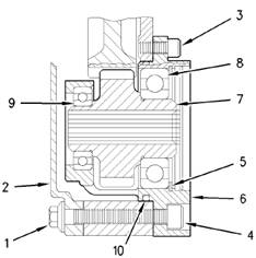 4.將前殼體(6)的法蘭盤放置到一個合適的支座上。從前殼體(6)推壓出齒輪(7)以及軸承(8和9)的組件。為了從齒輪(7)拆下軸承(8和9),使用一個合適的拉拔器。