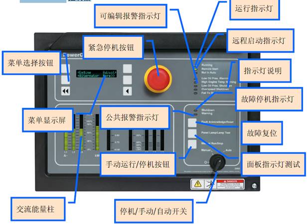緊急停機(jī)按鈕:機(jī)組發(fā)生緊急情況時(shí)按下此按鈕,機(jī)組立即停機(jī),在此情況下,機(jī)組不能啟動(dòng)。