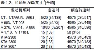 油溫在225°F[107°C]時的正常的發(fā)動機(jī)機(jī)油壓力列于表1-2中。