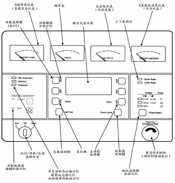 數(shù)字式顯示屏:兩行/每行16字符數(shù)字式顯示屏,用于功能操作系統(tǒng),結(jié)合顯示屏功能選擇鍵和主功能選擇鍵使用。參考本章后面的功能樹(shù)。顯示屏也同時(shí)顯示報(bào)警與報(bào)警停機(jī)信號(hào)。