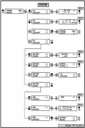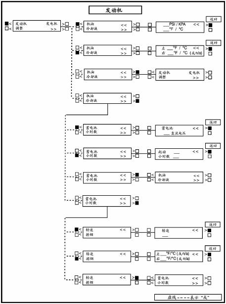 下一頁(yè)顯示了主功能和一些子功能的方框圖。如圖所示,主功能可進(jìn)一步分為四個(gè)子功能。如果需要顯示發(fā)動(dòng)機(jī)參數(shù),如機(jī)油壓力和機(jī)油溫度、水溫、發(fā)動(dòng)機(jī)轉(zhuǎn)速(RPM)和排煙溫度等,按顯示屏上“ENGINE”(發(fā)動(dòng)機(jī))附近的按鍵,參考本章“ENGINEMEMU”(發(fā)動(dòng)機(jī)功能)。
