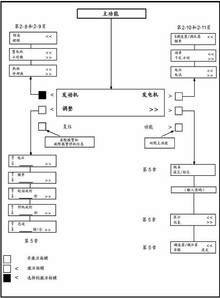 圖2-2給出了數(shù)字式顯示屏及其功能選擇鍵,請(qǐng)查閱前頁(yè)的“前端面板”關(guān)于功能顯示屏和按鍵的說(shuō)明。當(dāng)不起動(dòng)發(fā)電機(jī)組在備用模式下操作和查看功能顯示屏?xí)r,按下然后釋放自我偵測(cè)鍵,這將會(huì)初始化PCC操作軟件,同時(shí)允許操作功能顯示面板,如果30秒內(nèi)沒(méi)有選擇任何功能,軟件定時(shí)器將會(huì)自動(dòng)切斷電源。在接電模式下,控制盤(pán)一直帶電,顯示屏一直處于工作狀態(tài)。