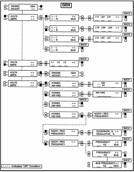 如果需要顯示發(fā)電機(jī)參數(shù),如電壓、電流、輸出功率(千瓦)和頻率,按顯示屏上“GEN”附近的按鍵,通過(guò)此功能分支還可以查看母排電壓、頻率和數(shù)字式同步信息。參考本章GENMENU(發(fā)電機(jī)功能)。如果需要調(diào)整輸出電壓、頻率或起動(dòng)和停機(jī)延時(shí)等,按顯示屏上“ADJUST”(調(diào)整)附近的按鍵,參考第5章“ADJUSTMENU”(調(diào)整功能)。