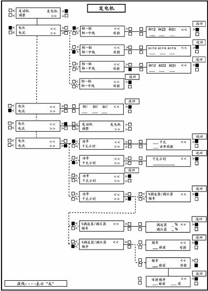 如果在初次起動(dòng)設(shè)定(InitialStartSetup)子功能中選擇的是△接法,當(dāng)選擇VOLTS(電壓)時(shí),“相-相”或“相-中線(xiàn)”子功能將不會(huì)顯示出來(lái),僅顯示子功能L12、L23和L31。功率/千瓦小時(shí)(POWER/KWHOURS)子功能:由電壓/電流(VOLTS/AMPS)子功能,按顯示屏中“>>”旁的按鍵將移至顯示功率/千瓦小時(shí)(POWER/KWHOURS)子功能。選擇POWER(功率)顯示以千瓦為單位的輸出功率及功率因數(shù)值,選擇KWHOURS(千瓦小時(shí))顯示千瓦小時(shí)輸出。在顯示輸出或千瓦小時(shí)參數(shù)的狀態(tài)下,按“<<”旁的按鍵顯示屏將返回到(“BACK”)功率/千瓦小時(shí)(POWER/KW