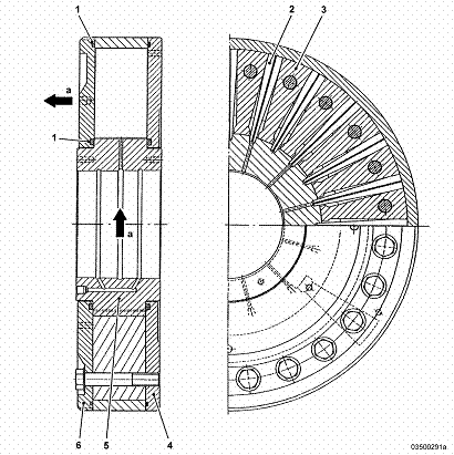 描述:減震器的作用是通過彈簧片的變形來增加阻尼,用以平衡曲軸的扭矩。曲軸的扭矩和振動都是通過彈簧片進行衰減的。減震器的中心星形支架與外部構件通過板簧連接,彈簧片的一部分被緊緊的夾在中間構件內(nèi)部,還有一部分被插在星形架上沿軸向分布的凹槽內(nèi)。彈簧片與內(nèi)部構件間形成了油腔,在柴油機運行期間,減震器內(nèi)存在潤滑油壓。潤滑油通過曲軸油道進入減震器內(nèi),然后回流至曲軸箱承油盤。當有扭矩或振動傳遞時,彈簧片變形,彈簧片的內(nèi)外圈間產(chǎn)生相對運動,致使彈簧片與內(nèi)部構件間的油室空間發(fā)生波動,油室內(nèi)的潤滑油受擠壓從端蓋上的油孔排出,這樣內(nèi)外圈間的相對運動就會被阻滯,扭矩或振動就被衰減消除了。內(nèi)部構件限制了彈簧片的形變量,因此減震器可以在短時間內(nèi)消除曲軸扭矩及振動。