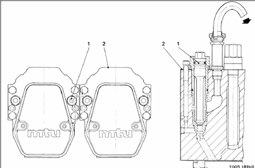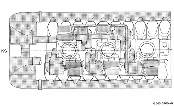 MTU956 柴油機機身凈重20.7噸,共20缸V 形結構,總長約5670mm,機體用球墨鑄鐵制成,以保證足夠的剛度。鋼制的軸承蓋裝在軸承座中,依靠側(cè)壁與機體配合定位。主軸承蓋垂直方向用縱向拉緊螺栓,水平方向用橫向拉緊螺栓固定在機體的中分面上。曲軸由十三個滑動軸承支承在由機體中分面下軸承座和主軸承蓋組成的主軸承孔中,并在曲軸輸出端用一個由凸緣襯套和向心推力軸承組成的止推軸承實現(xiàn)軸向定位。兩根凸輪軸布置在機體中位置較高的地方,這樣可縮短推桿,從而有助于提高配氣機構剛度。由特種鑄鐵離心澆鑄成的濕式缸套從機體上方裝入,每只缸套上用凸肩密封,下方用密封環(huán)密封。排氣管是帶絕熱層的分段焊接結構,布置在V型夾角內(nèi)。發(fā)動機回水管,五個雙級增壓器(A側(cè)兩個B側(cè)三個)和進氣總管都布置在V型夾角內(nèi),進氣處有六個進氣過濾器對氣體進行過濾。