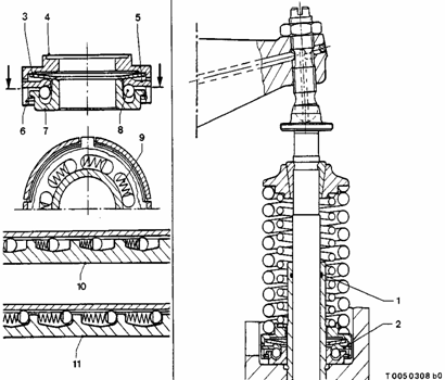 描述:下彈簧座的作用除了支持彈簧外,主要是旋轉(zhuǎn)氣閥,避免氣閥受熱不均或閥座積碳。該彈簧座由帶凹槽的環(huán)形座體以及彈簧、鋼珠、壓蓋等組成。在座體內(nèi)的每個凹槽內(nèi)布置有一個鋼珠,當閥門關時,鋼珠被凹槽內(nèi)的彈簧頂在凹槽最高位置(如11),一個內(nèi)凹的蝶形墊圈安裝在環(huán)形座體與壓蓋之間,由壓蓋將彈簧的形變傳遞到蝶形墊圈上。