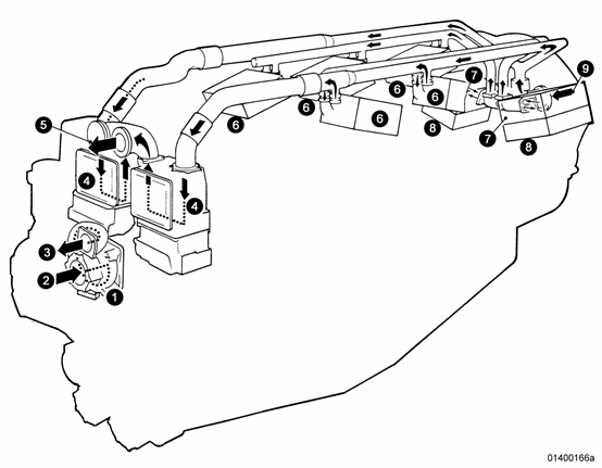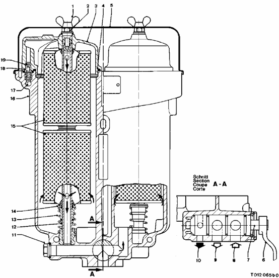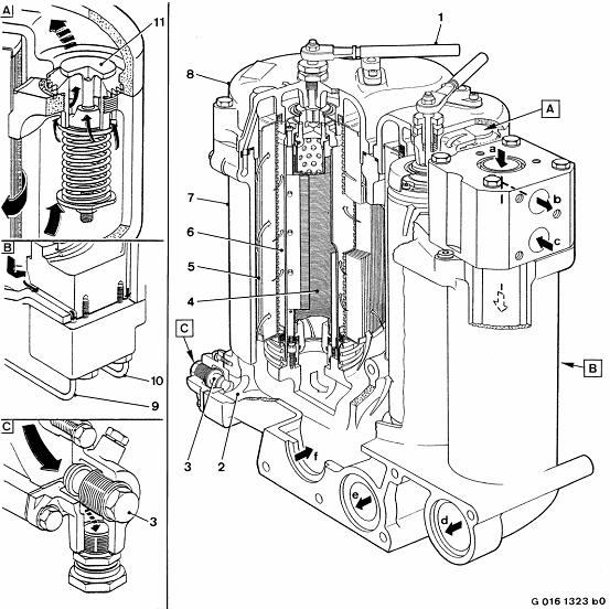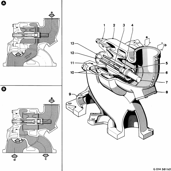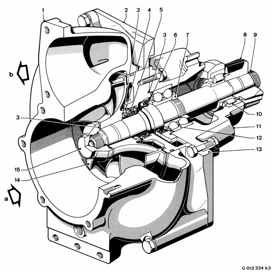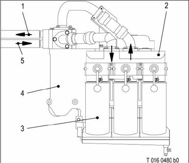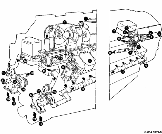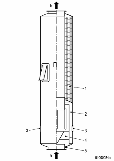 描述:曲軸箱呼吸器與壓氣機的進氣相連,在曲軸箱內(nèi)形成微負壓,壓氣機把油氣混合氣體從曲軸箱的吸入管線b處吸到進氣氣室和壓縮空氣氣室之間的凝結機構中,混合氣中的油粒子會被分離到凝結機構中冷凝,凝結后的油通過回油管道(虹吸管)送回到曲軸箱中。