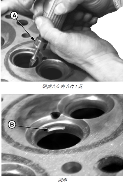 1. 用硬質(zhì)合金去毛邊工具 (A) 提起閥門座鑲?cè)Φ撞康拿?nbsp;(B)。