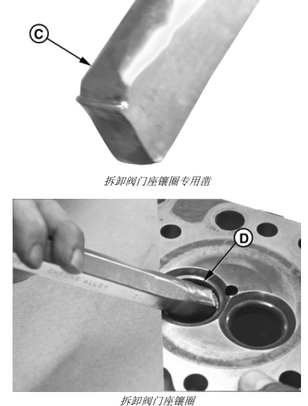 2. 用紙板或棉布保護(hù)缸蓋表面。用錘子敲打用專用圓頭鑿(C) 的手柄,直到閥門座鑲?cè)?D) 松動(dòng)。