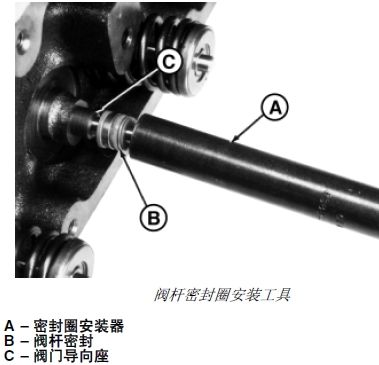 3. 用 JDG678 閥桿密封圈安裝器 (A) 將閥桿密封圈 (B)滑入閥桿內(nèi),套在閥門(mén)導(dǎo)向座 (C) 上。