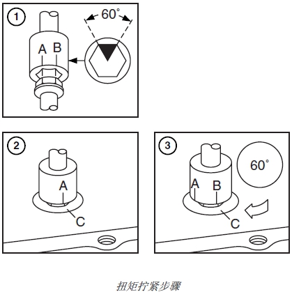 第 4 步-最后-扭矩 . . . . . . 將每個(gè)螺釘再扭轉(zhuǎn) 60° ± 10°。(參見(jiàn)本章的“用扭矩角度盤擰至正確扭矩”部分。)