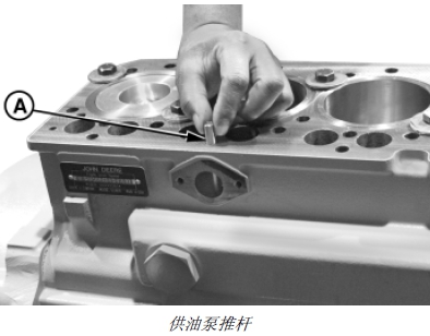 1. 安裝缸蓋前,在供油泵推桿 (A) (如果裝備)上涂抹干凈的John Deere約翰迪爾強(qiáng)鹿柴油發(fā)動(dòng)機(jī)潤(rùn)滑油,然后小心地裝到缸體中。
