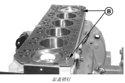 2. 如已拆下,在缸體定位孔中重新裝兩個(gè)定位銷(B)。