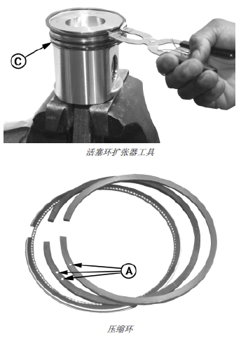 5. 將方形壓縮環(huán)的開口定位在活塞控油環(huán) (C) 開口的對(duì)面。