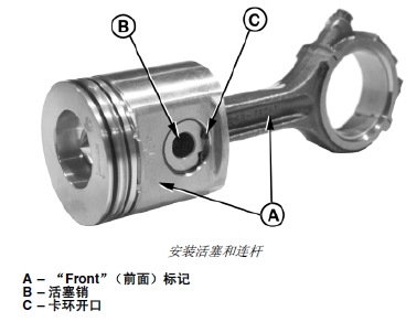 重要提示: 活塞必須安裝到原先從連桿拆下的位置,還必須使用新的活塞銷卡環(huán)。必須正確安裝活塞和連桿,這樣當(dāng)連桿長(zhǎng)軸面向John Deere約翰迪爾強(qiáng)鹿柴油發(fā)動(dòng)機(jī)凸輪軸一側(cè)時(shí),活塞燃燒碗應(yīng)移向John Deere約翰迪爾強(qiáng)鹿柴油發(fā)動(dòng)機(jī)噴油泵一側(cè)。