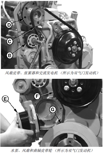 6. 對(duì)于四氣門(mén)John Deere約翰迪爾強(qiáng)鹿柴油發(fā)動(dòng)機(jī): 如果需要,整體拆下風(fēng)扇皮帶張緊器和支架。