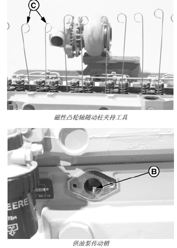 7. 維修臺(tái)上的John Deere約翰迪爾強(qiáng)鹿柴油發(fā)動(dòng)機(jī)要轉(zhuǎn)一定角度,使凸輪軸隨動(dòng)柱和供油泵制動(dòng)銷(xiāo) (B) 沿凸輪軸凸輪緣脫離。