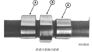 2. 檢查所有凸輪軸凸輪緣 (A) 和軸頸 (B) 是否磨損或損壞。必要時(shí)更換凸輪軸。