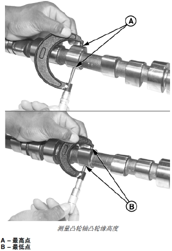 1. 在最高點(diǎn) (A) 和最低點(diǎn) (B) 分別測(cè)量每個(gè)凸輪緣。它們尺寸之間的差別就是凸輪軸凸輪緣高度。如果凸輪軸上任一凸輪緣的高度不符合技術(shù)規(guī)格的要求,應(yīng)安