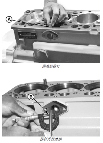 2. 測(cè)量推桿外徑 (B)。如果推桿外徑小于技術(shù)規(guī)格,安裝新推桿。