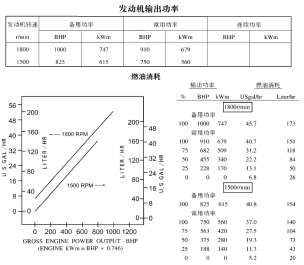 所有的數(shù)據(jù)均是基于發(fā)動機(jī)帶燃油泵、水泵、機(jī)油泵、空濾器和消聲器運(yùn)轉(zhuǎn)時獲得的,但不帶有充電機(jī)、空壓機(jī)、風(fēng)扇、選用設(shè)備和驅(qū)動件。所有的數(shù)據(jù)都是基于ISO 3046標(biāo)準(zhǔn)參考的條件—海拔110m(361ft),大氣壓力100kPa(29.53inHg),進(jìn)氣溫度25℃ (77°F),相對濕度30%,使用標(biāo)準(zhǔn)No.2號柴油或符合ASTM D975的柴油。