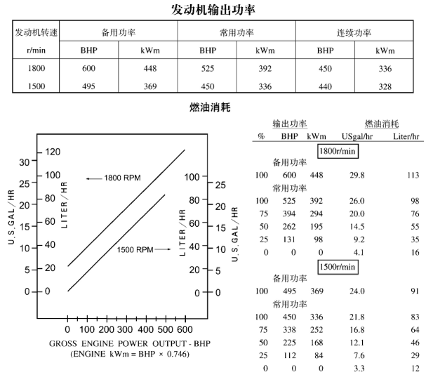 所有的數(shù)據(jù)均是基于發(fā)動機帶燃油泵、水泵、機油泵、空濾器和消聲器運轉時獲得的,但不帶有充電機、空壓機、風扇、選用設備和驅動件。所有的數(shù)據(jù)都是基于ISO 3046標準參考的條件—海拔110m(361ft),大氣壓力100kPa(29.53inHg),進氣溫度25℃ (77°F),相對濕度30%,使用標準No.2號柴油或符合ASTM D975的柴油。